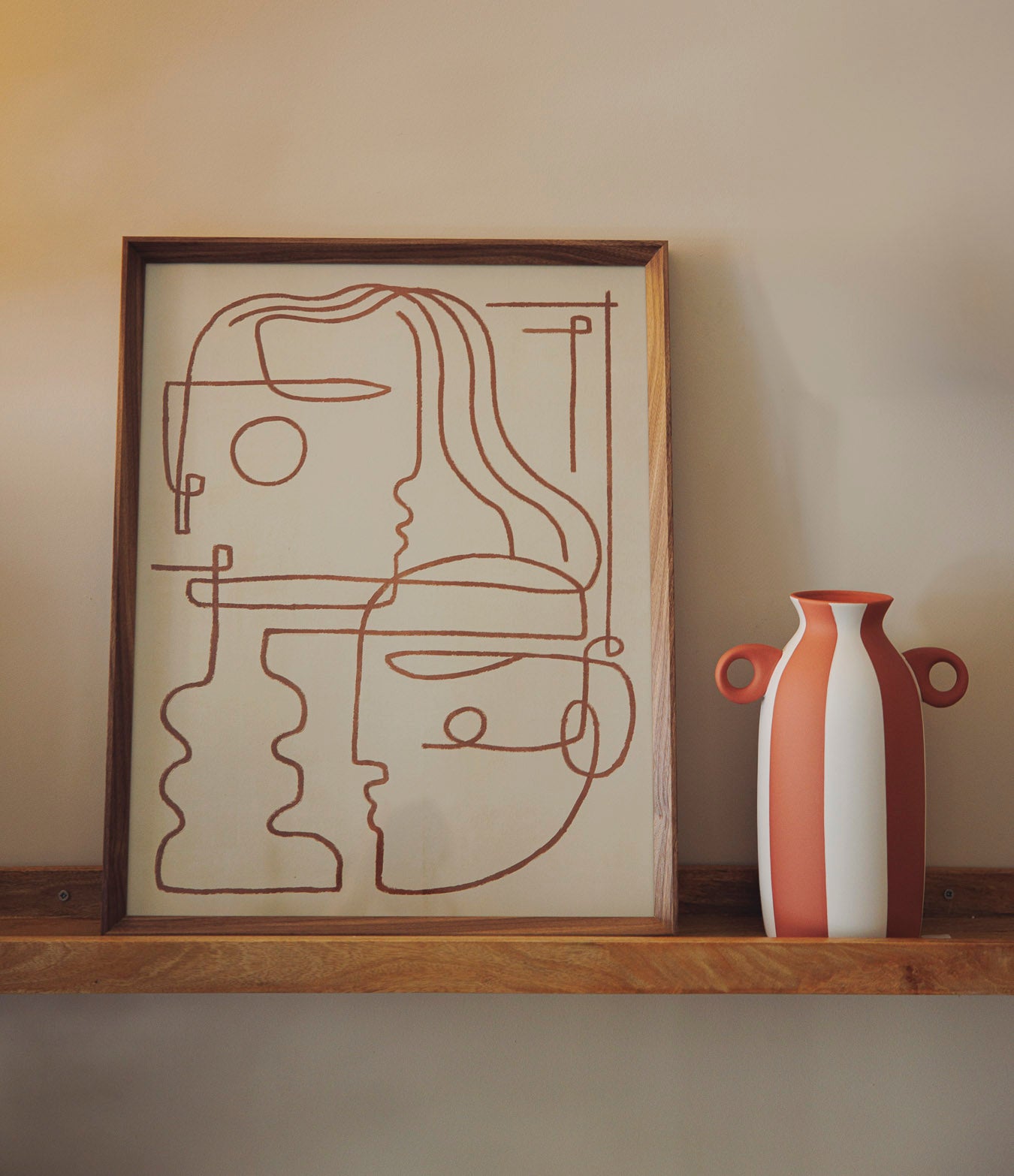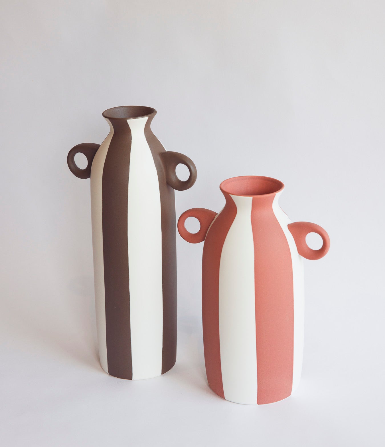 שני אגרטלים צבעוניים עם אופי, שילוב של קווים נקיים, צורת ידיות מפתיעה ופסים בגוונים טבעיים של טרקוטה וחום. נוכחות שמביאה איתה גם שקט וגם סטייל, מושלמים לפרחים – אבל גם פשוט ככה, כמו שהם