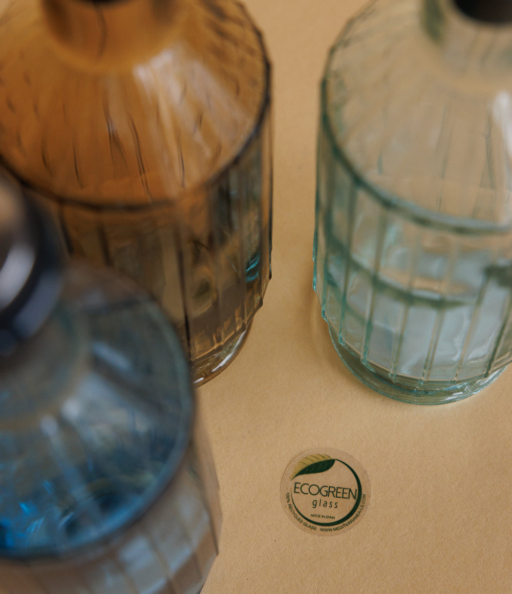 בקבוק שמן/חומץ זכוכית צבעונית כחול, ירקרק וחום פיה ממתכת