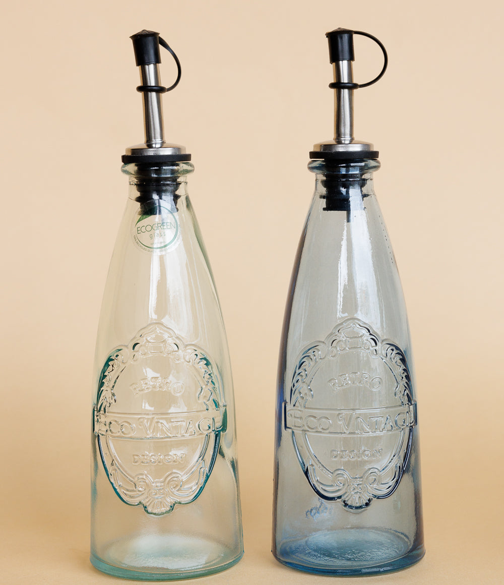 בקבוק שמן/חומץ זכוכית צבעונית כחול וירקרק, פיה ממתכת