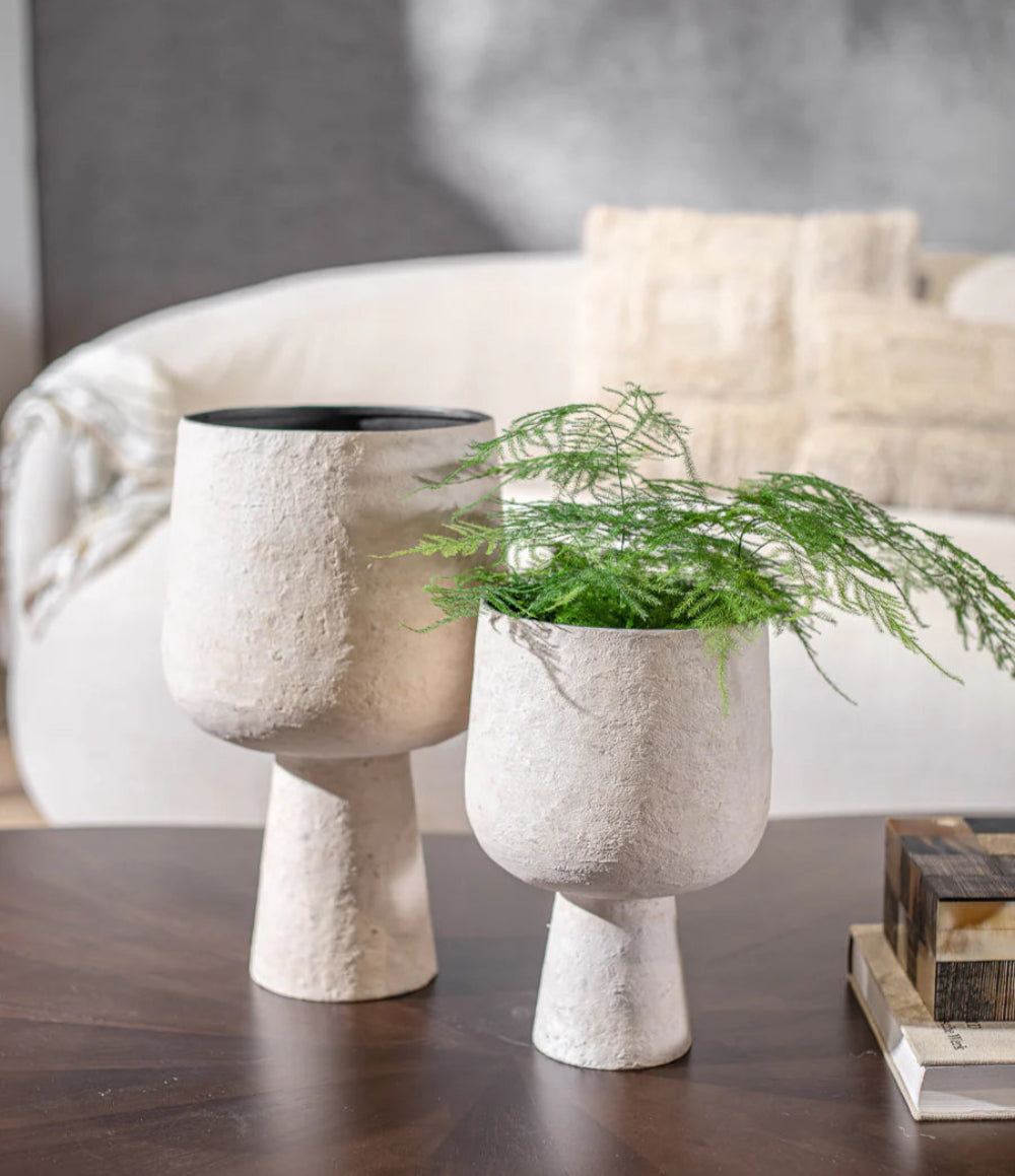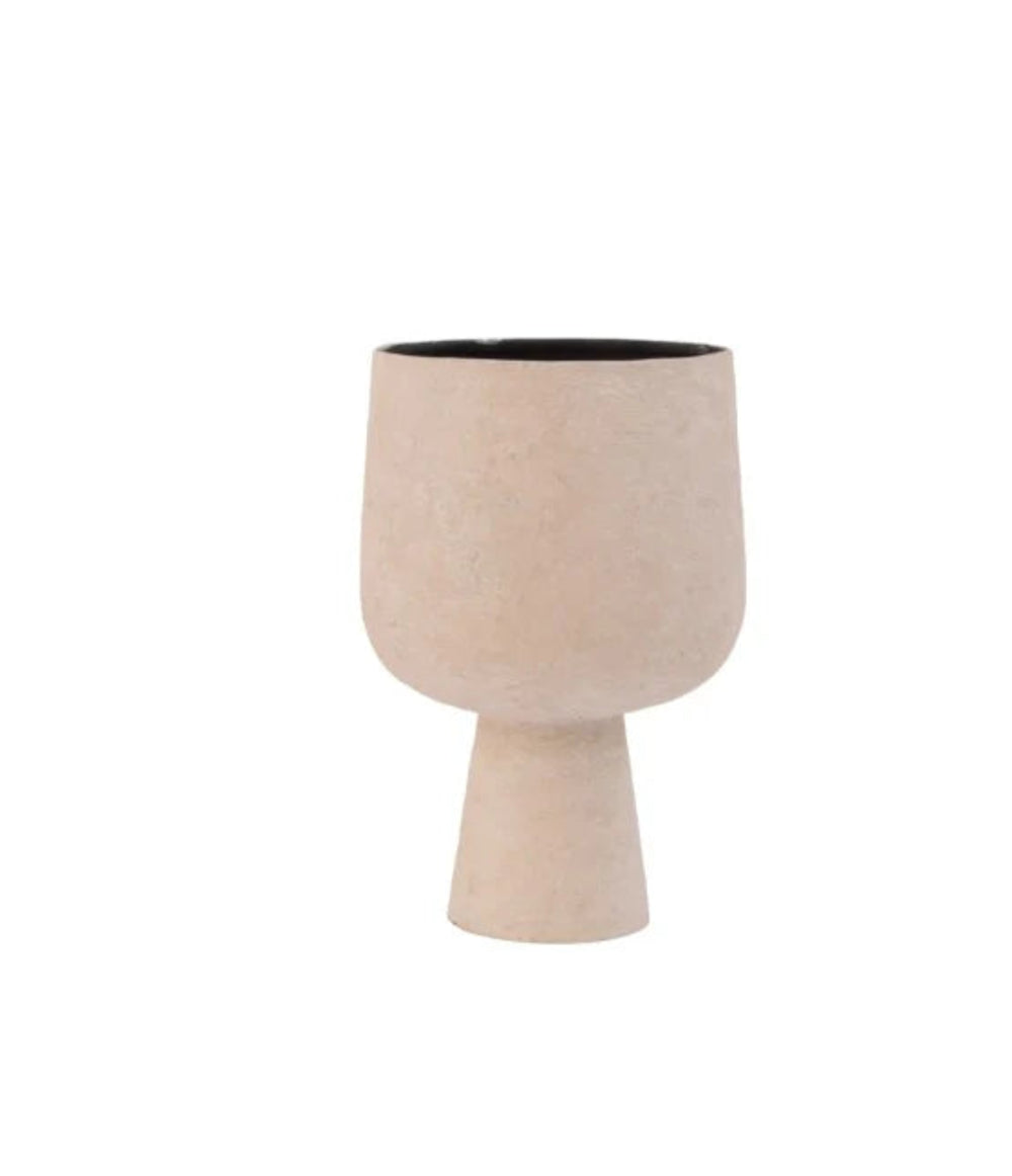 בית עציץ מתכת סנדסטון בצבע בז על רגל סטייל נורדי עכשווי ניתן להניח על שידה או בספרייה להשלמת המראה המעוצב ניתן לשים עציץ או פרחים מיובשים