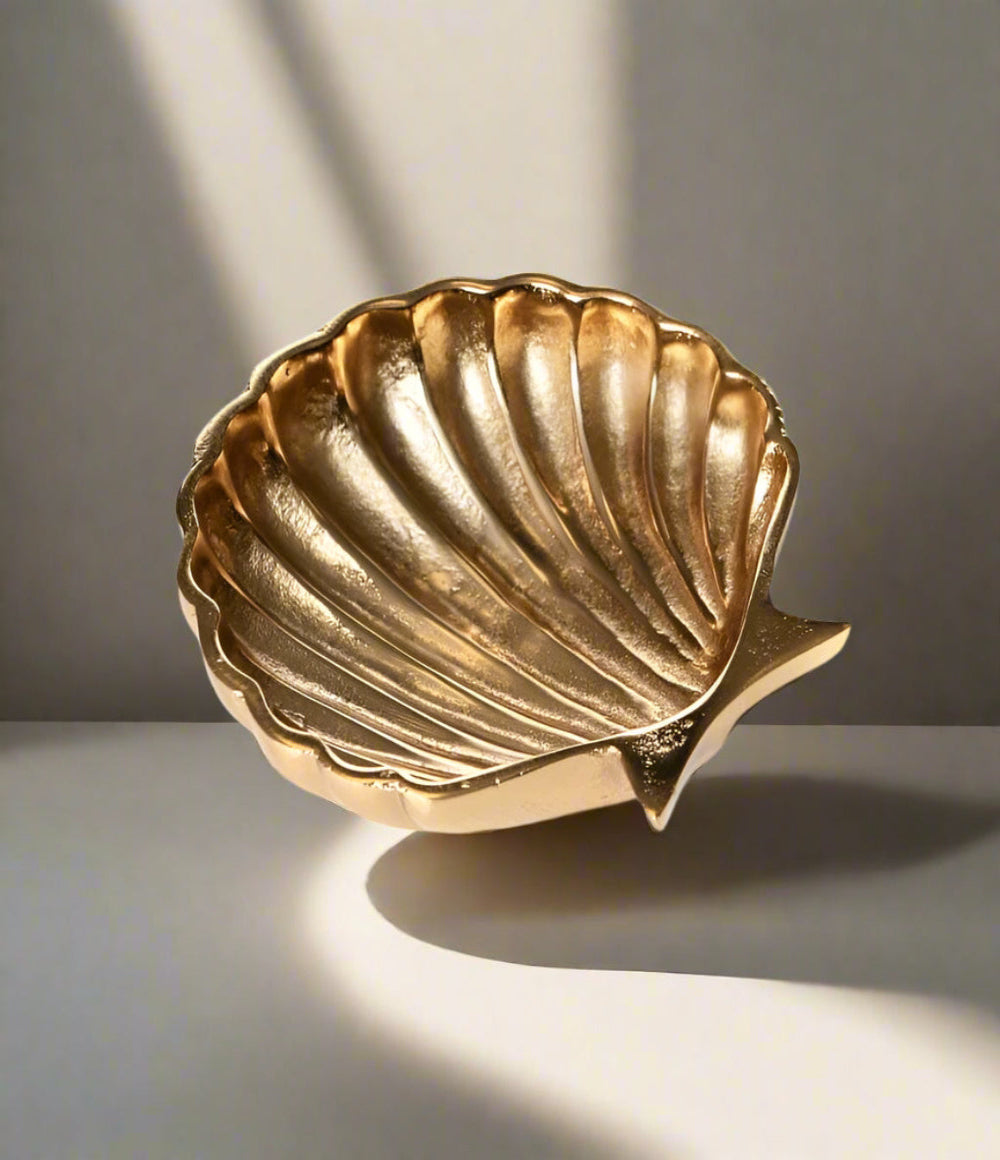 ,קערית צדף מאלומיניום בגוון זהב מושלמת להגשת פיצוחים בשולחן אירוח, כתכשיט לעיצוב מדף לתכשיטים או למפתחות