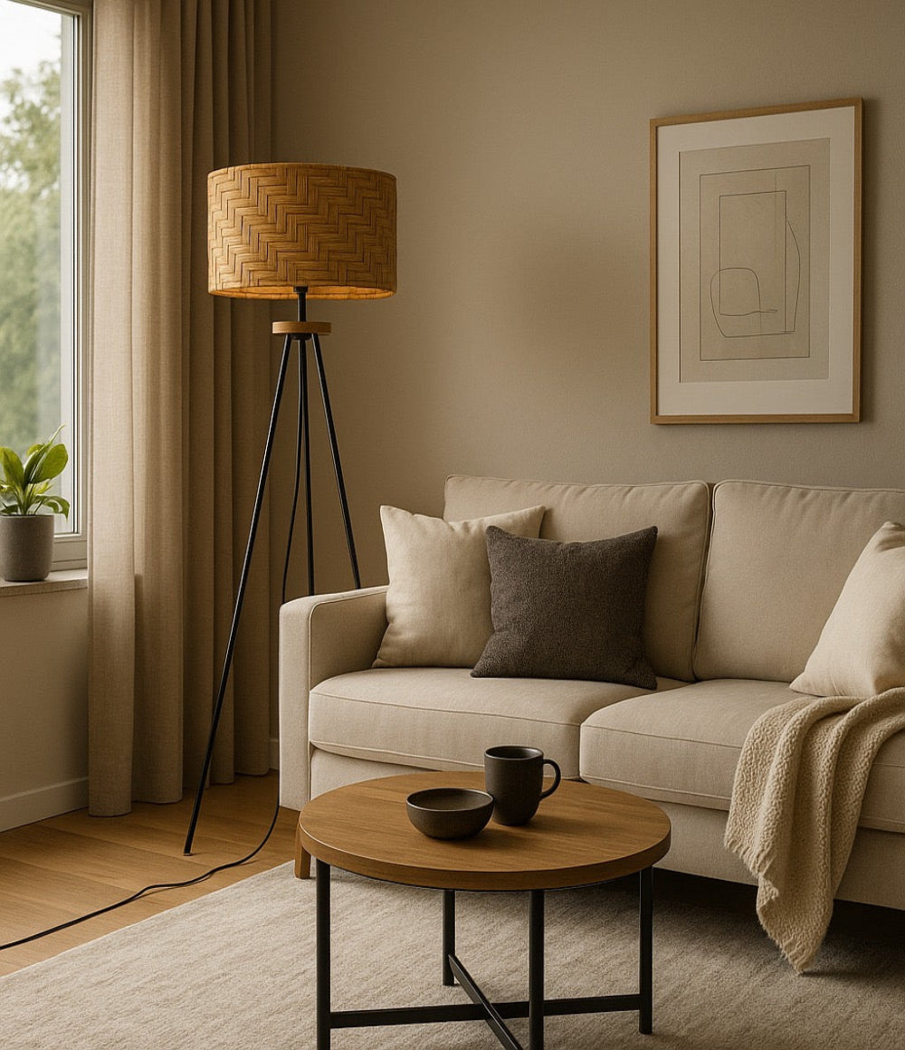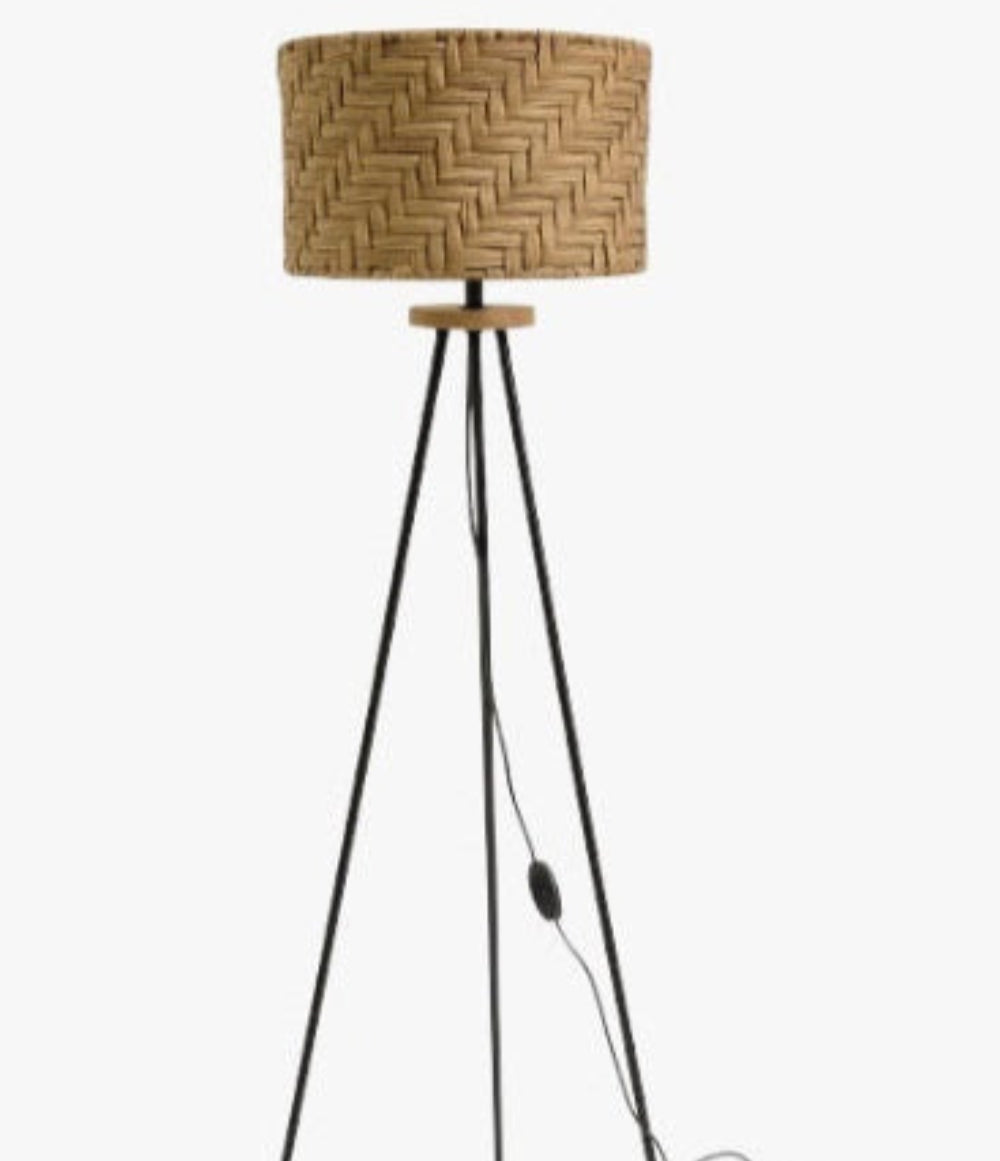 מנורה עומדת מארי בעלת רגלי ברזל אלגנטיות ואהיל קש .מתאים לחדר משפחה לאווירה אינטימית בבית