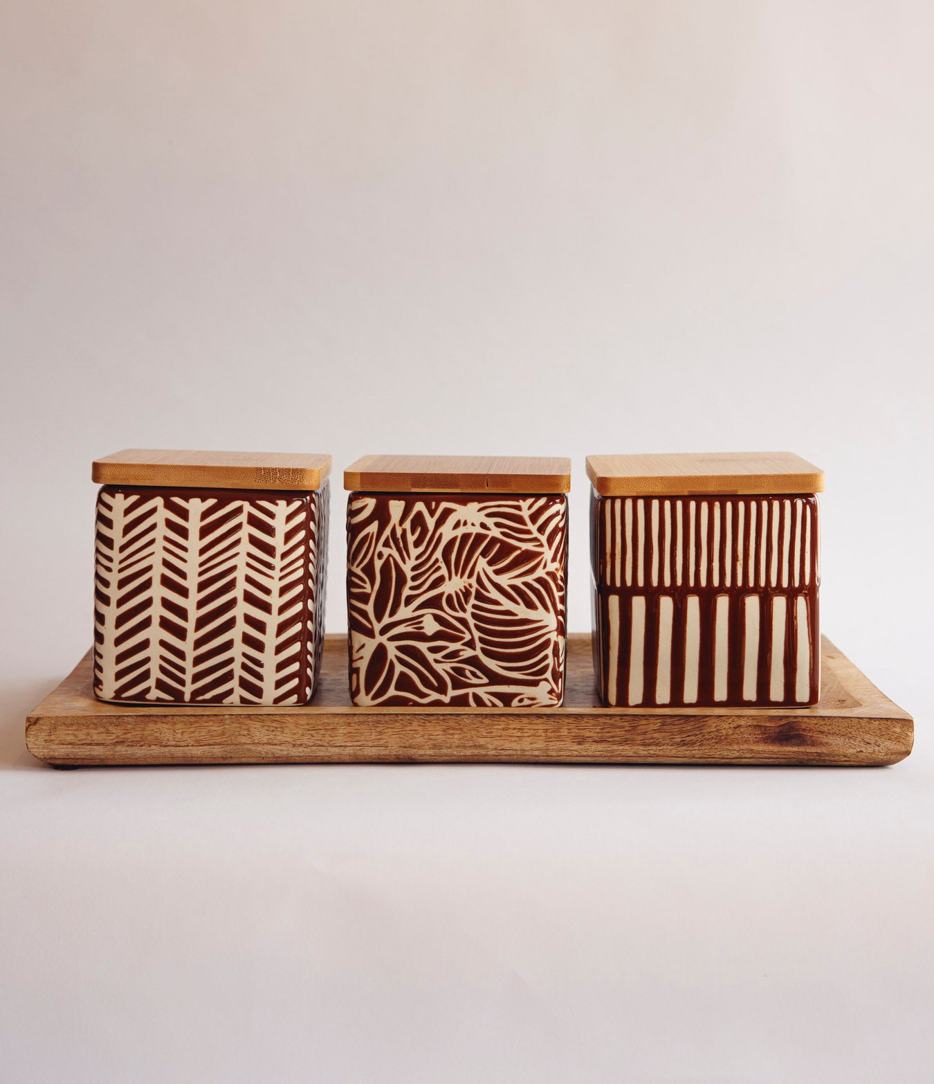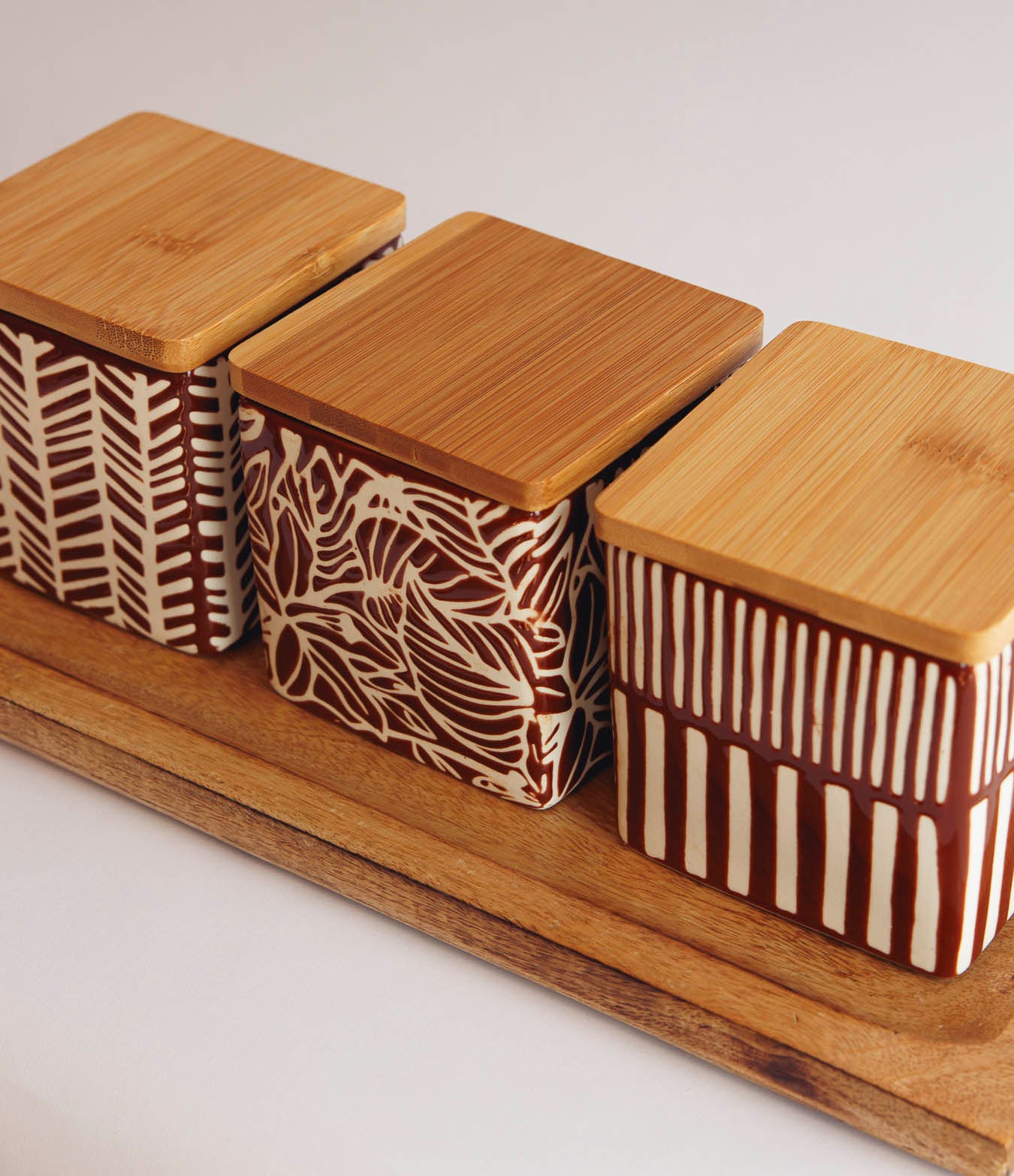 3 כלי קרמיקה לאחסון מכסה במבוק וטבעת סיליקון לאיטום. בגוון חום ולבן