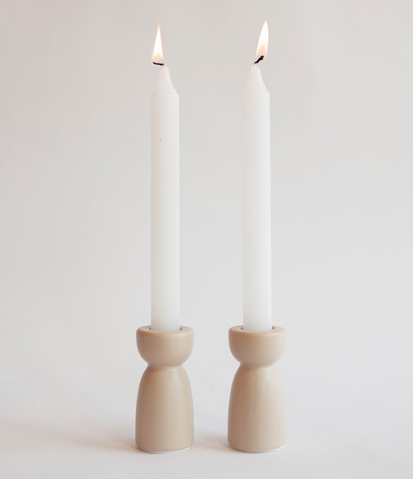 זוג פמוטים עשויים קרמיקה בגוון בג' טקסטורה חלקה ועדינה עיצוב ורך שמכניס חמימות לכל שולחן שבת או פינת אווירה פריט שמשלב אסתטיקה מודרנית – מושלם כמתנה או לתוספת ייחודית לבית