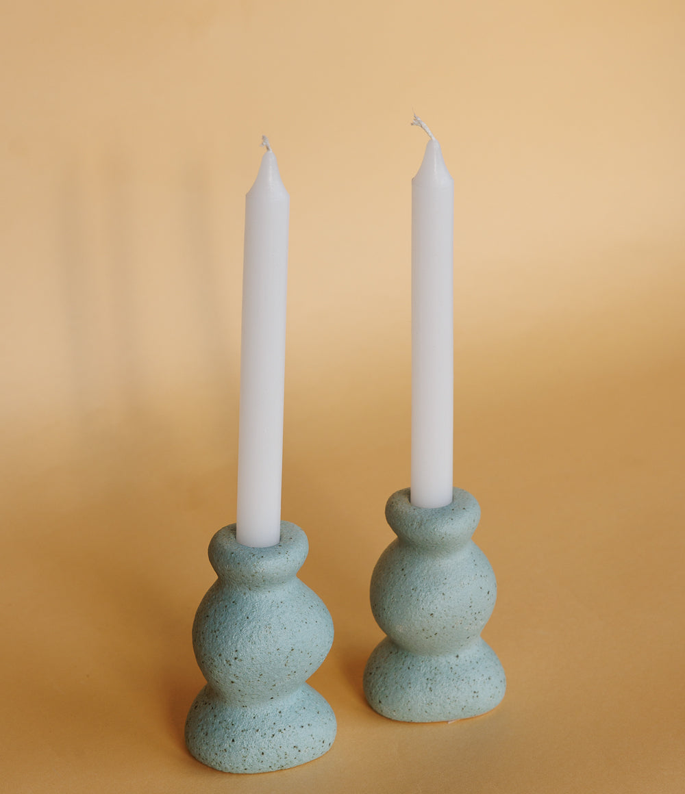זוג פמוטים בעבודת יד בגוון תכלת, עשויים קרמיקה בטקסטורה מחוספסת ועדינה