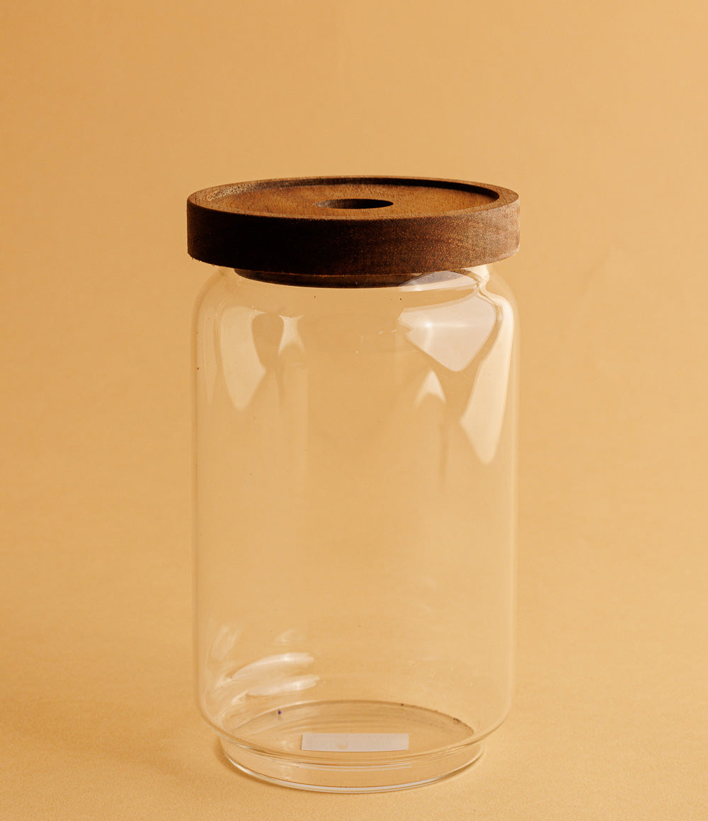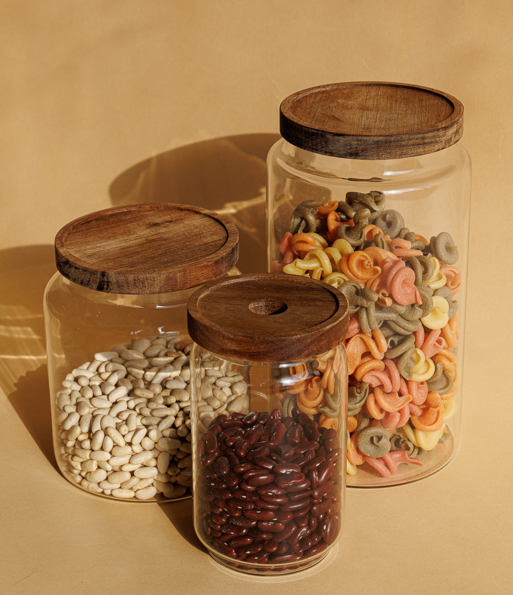 סדרת צנצנות אחסון מזכוכית עם מכסה עץ שיטה לאחסון מזון באופן הרמטי ואלגנטי
