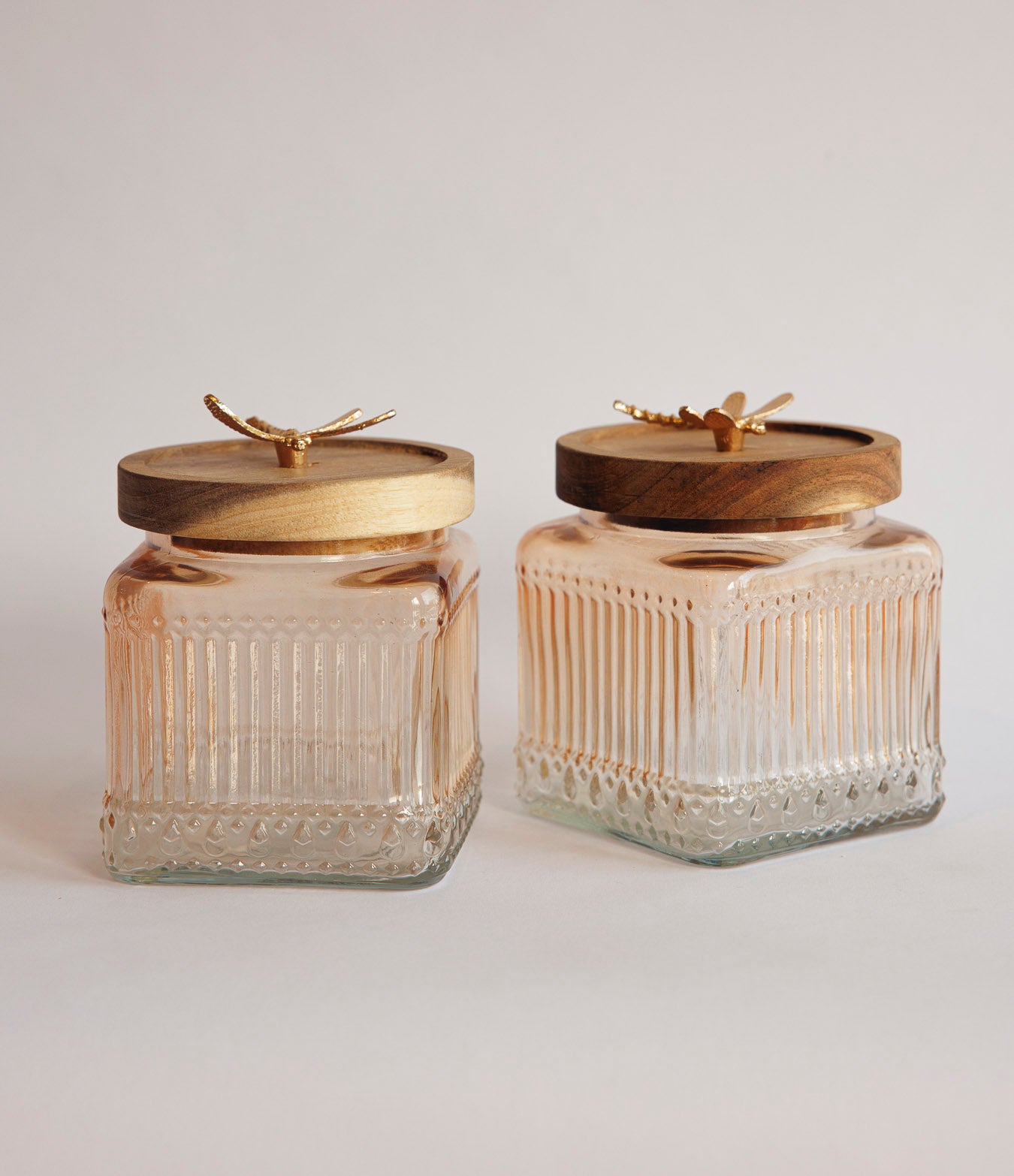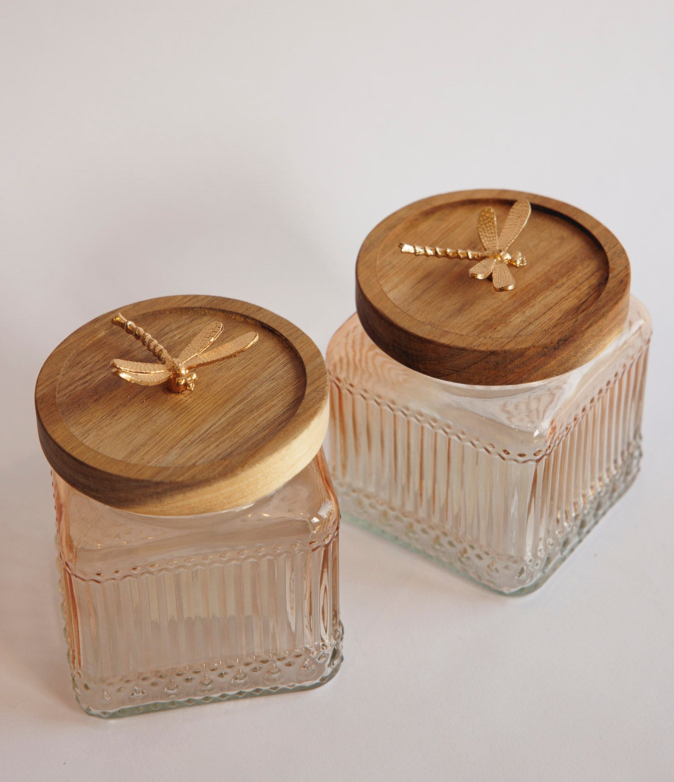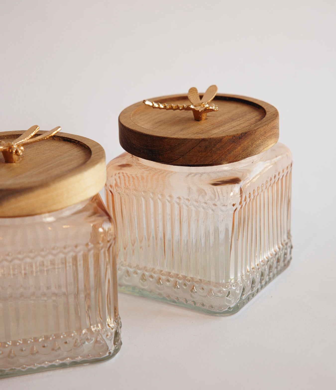 צנצנת זכוכית מרובעת ופסים ,מכסה עץ עם עיטור שפירית בזהב